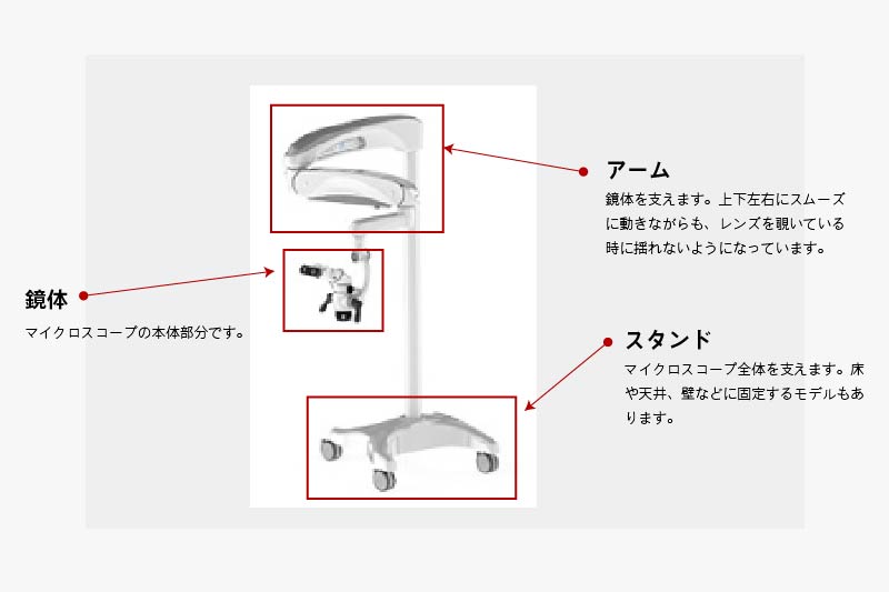 最近、歯科医院の診察室に[写真1]の様な大きな顕微鏡を置いている歯科医院が増えてきました。この機械を、「マイクロスコープ(歯科用顕微鏡)」と言います。元々は、脳外科手術や形成外科手術で用いられていた機材です。