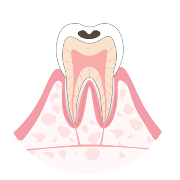 歯の表面のエナメル質が溶け始めた段階の虫歯です。 痛みがなく、ついつい放っておきがちです。虫歯の部分だけを削除して、合成樹脂(レジン)を充填します。