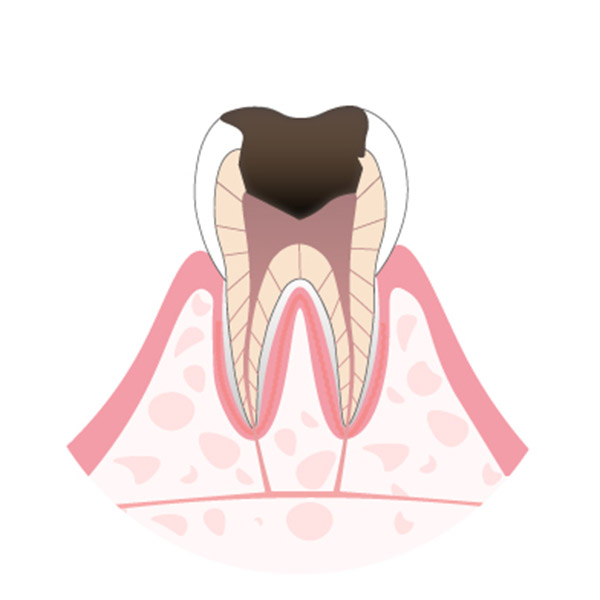 虫歯が象牙質の内側の歯髄に達したものです。 この段階では、歯髄に細菌が進入し激しい痛みを伴うことがあります。 歯髄の炎症が重度な場合は、歯髄組織を除去した後で根管内を消毒し、専用の詰め物を用いて充填します。