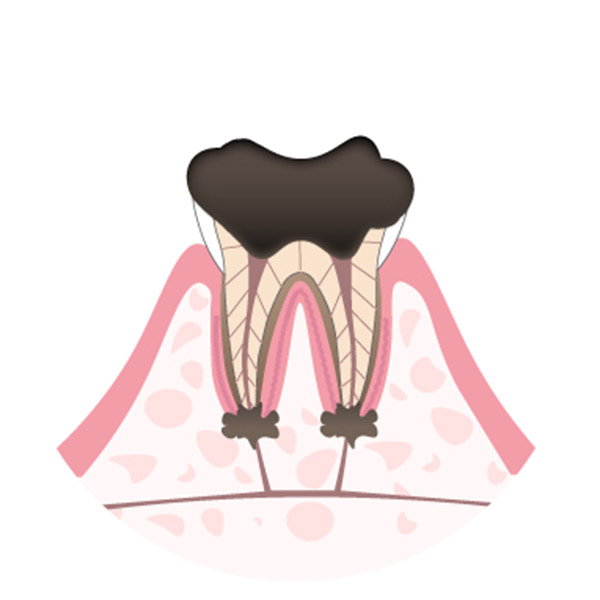 歯冠が溶けてなくなり、根の部分だけが残っている状態です。 C3の場合と同様に治療し被せ物をするか、やむを得ない場合は残った歯根部を抜歯します。